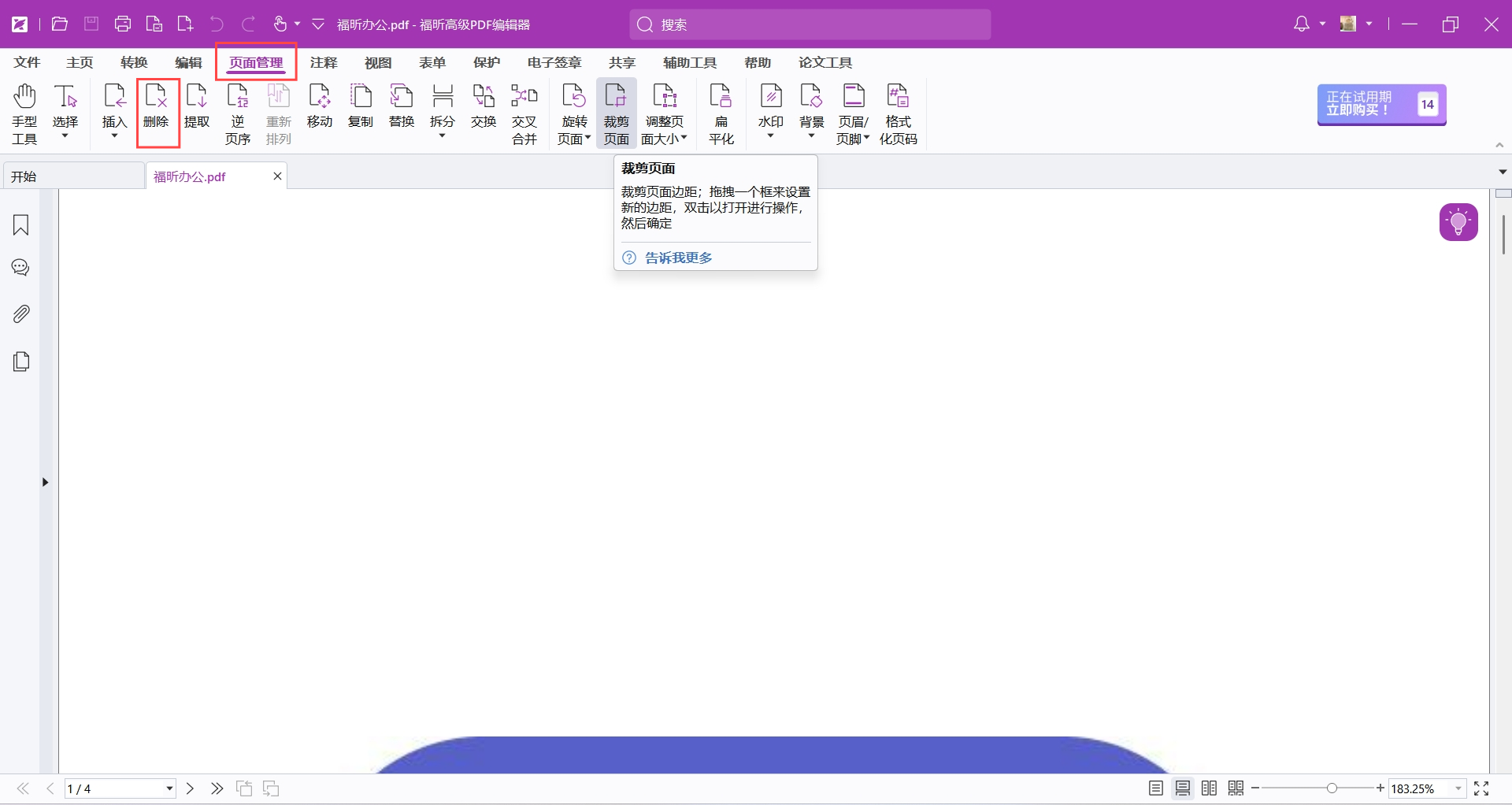 想要处理PDF文档的话,福昕PDF编辑器的删除PDF页面功能是一个简单而高效的方法,它可以让我们直接在PDF文件中进行编辑,不用另外转换成其他格式,从而避免了格式错乱和内容丢失的风险。而且这款工具除了删除页面之外还有添加页面、移动页面、复制页面等等多种方法,一起来学习一下详细的操作步骤吧。