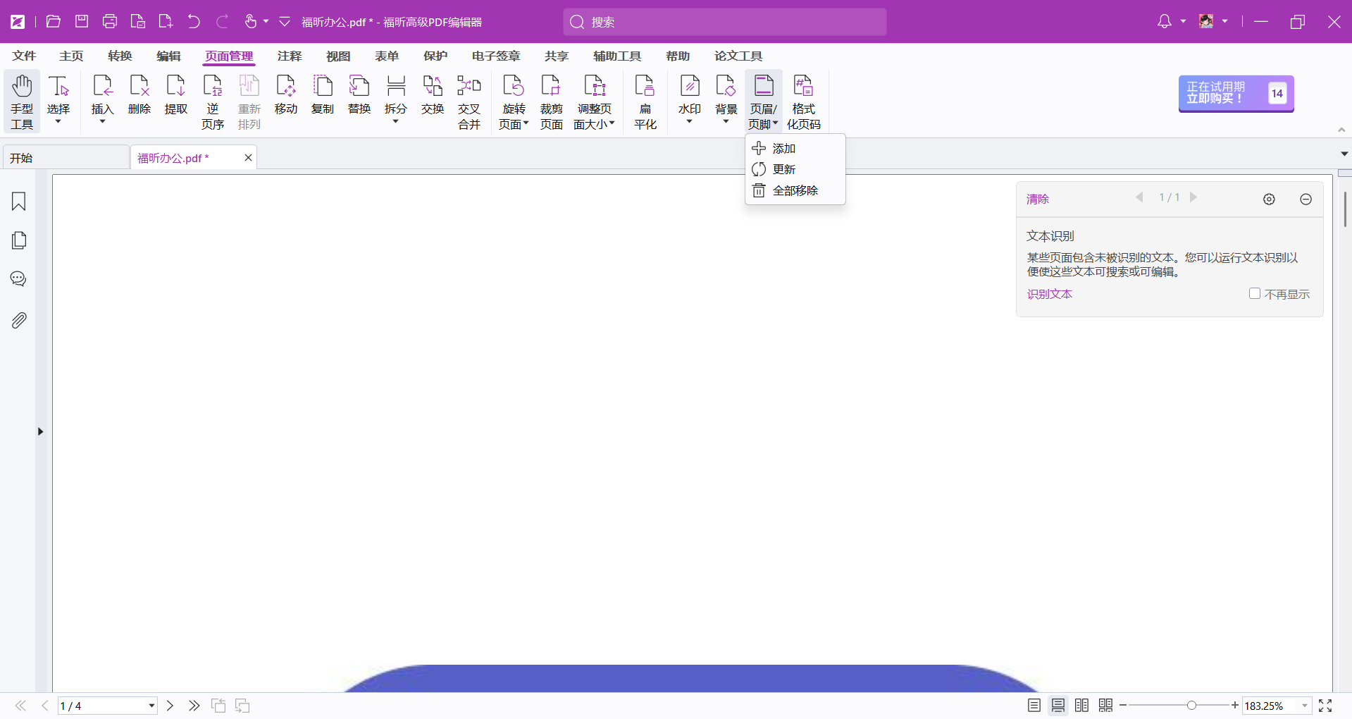 在福昕官网下载正版的福昕PDF编辑器,然后在电脑中安装好福昕PDF编辑器,然后双击打开软件后,导入PDF文档,之后选择功能【页面管理】中的【页眉页脚】中的添加。