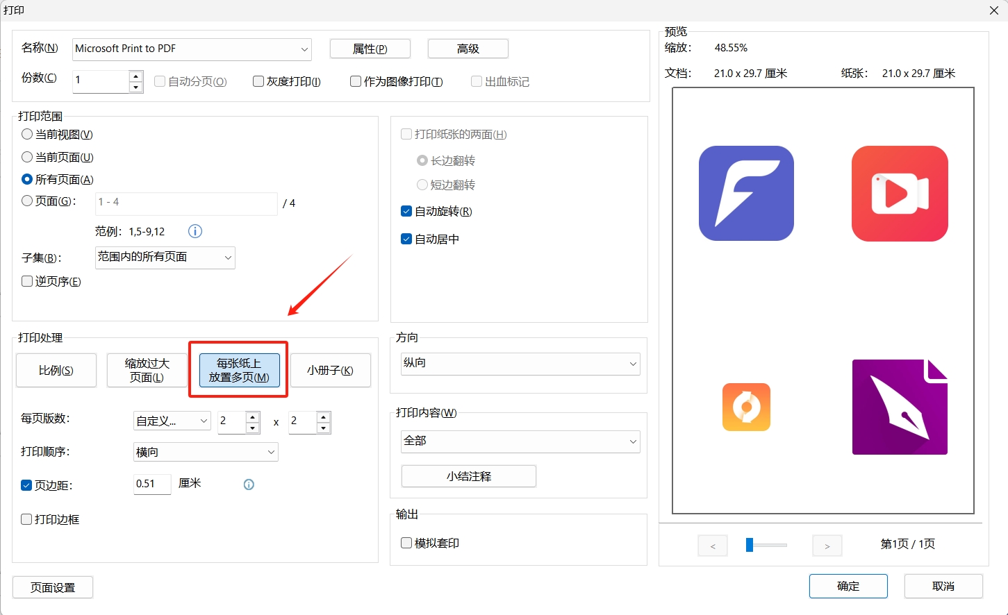 打开PDF文档之后,我们选择【打印】,然后在弹窗中,我们选择一页中放置多页,就可以实现多个页面合并为一个,这里需要注意的是记得选择打印机为foxit PDF,这样就可以将已经合并页面的PDF文档另外生成一个PDF文档了。