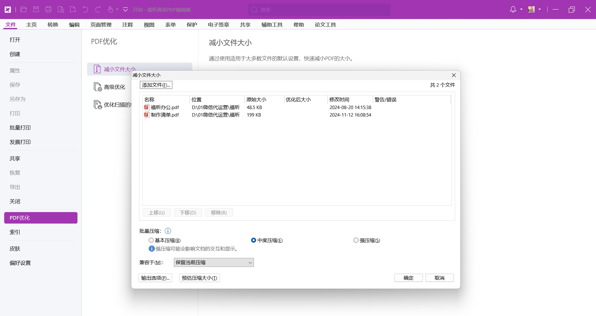 想要压缩多个PDF文档,而且还是批量压缩PDF体积的话,推荐大家使用福昕PDF编辑器MAC,它的批量处理速度非常快,采用了高效的算法,能够在短时间内完成大量的文件处理任务,不会占用我们过多的时间。同时,它还文持多线程处理,可以充分利用电脑的硬件资源,进一步提高处理速度。