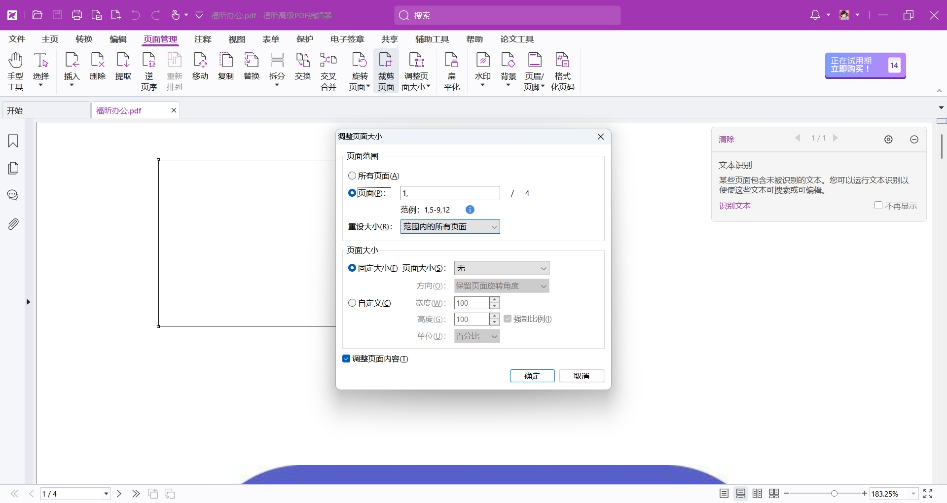 使用福昕PDF编辑器个人版,可以轻松调整PDF的页面大小。用户只需打开PDF文件,选择“页面”菜单中的“页面大小”选项,然后输入想要的页面尺寸即可完成调整。此外,还可以选择是否应用到所有页面或仅当前页面,并可预览调整后的效果。通过这一功能,用户可以根据需要自由地修改PDF文件的页面大小,使其更符合实际需求。操作简便,效果明显,十分实用。