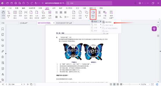 点击“视图”>“朗读”>“激活朗读”,选择从当前页开始朗读或者朗读当前页,即可让PDF文件自己开始朗读。我们还可以设置语速和音量。