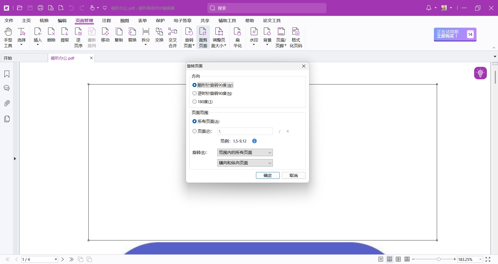 在弹窗中选择需要旋转的角度,这里可以直接旋转顺时针、逆时针90°,也可以直接竖向翻转,同时还可以选择需要调整页面范围,可以是全部页面也可以自定义页数,最后点击确定就可以了。