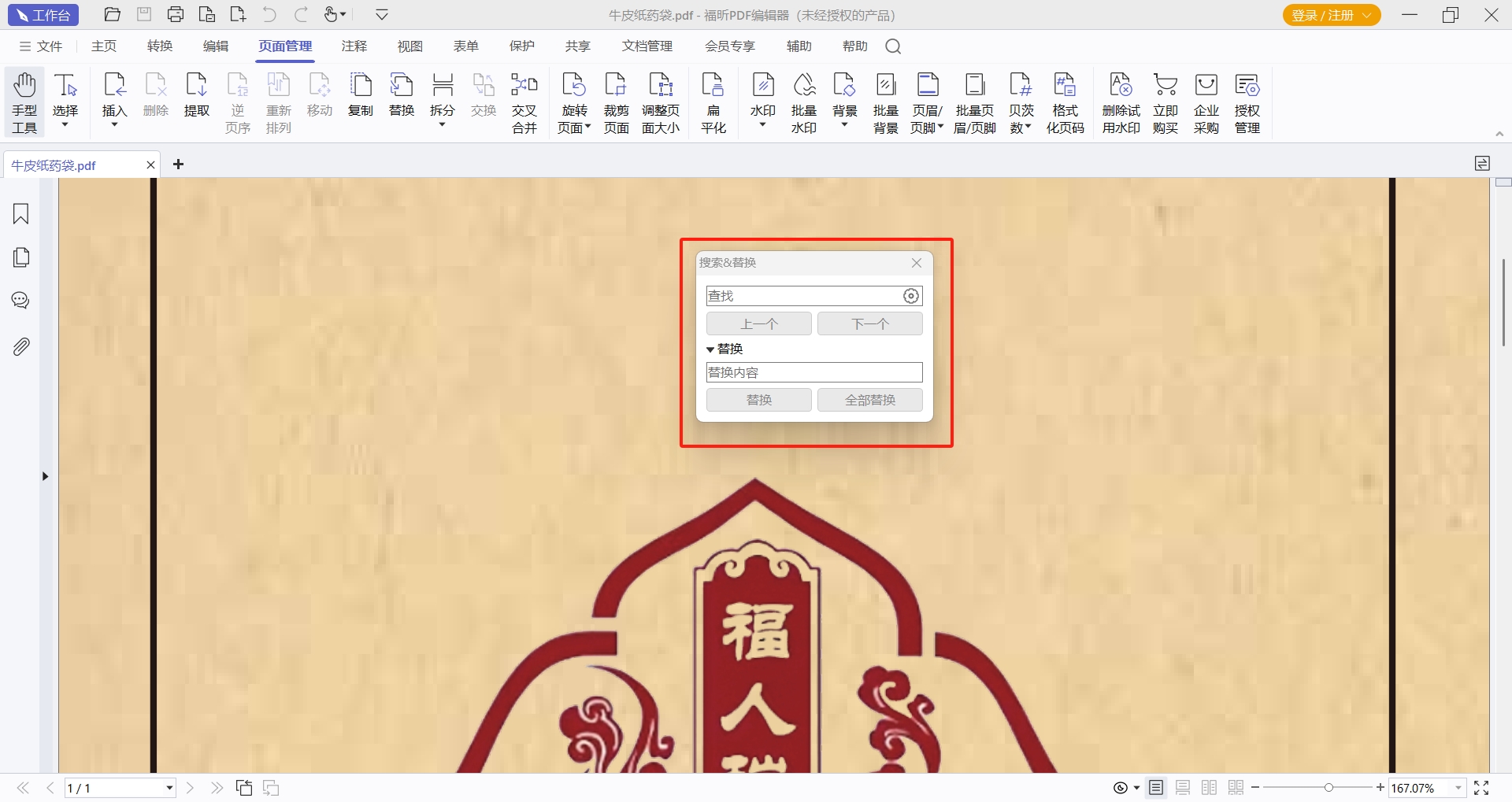 在打开PDF文档之后,选择【编辑】中的【搜索并替换】。