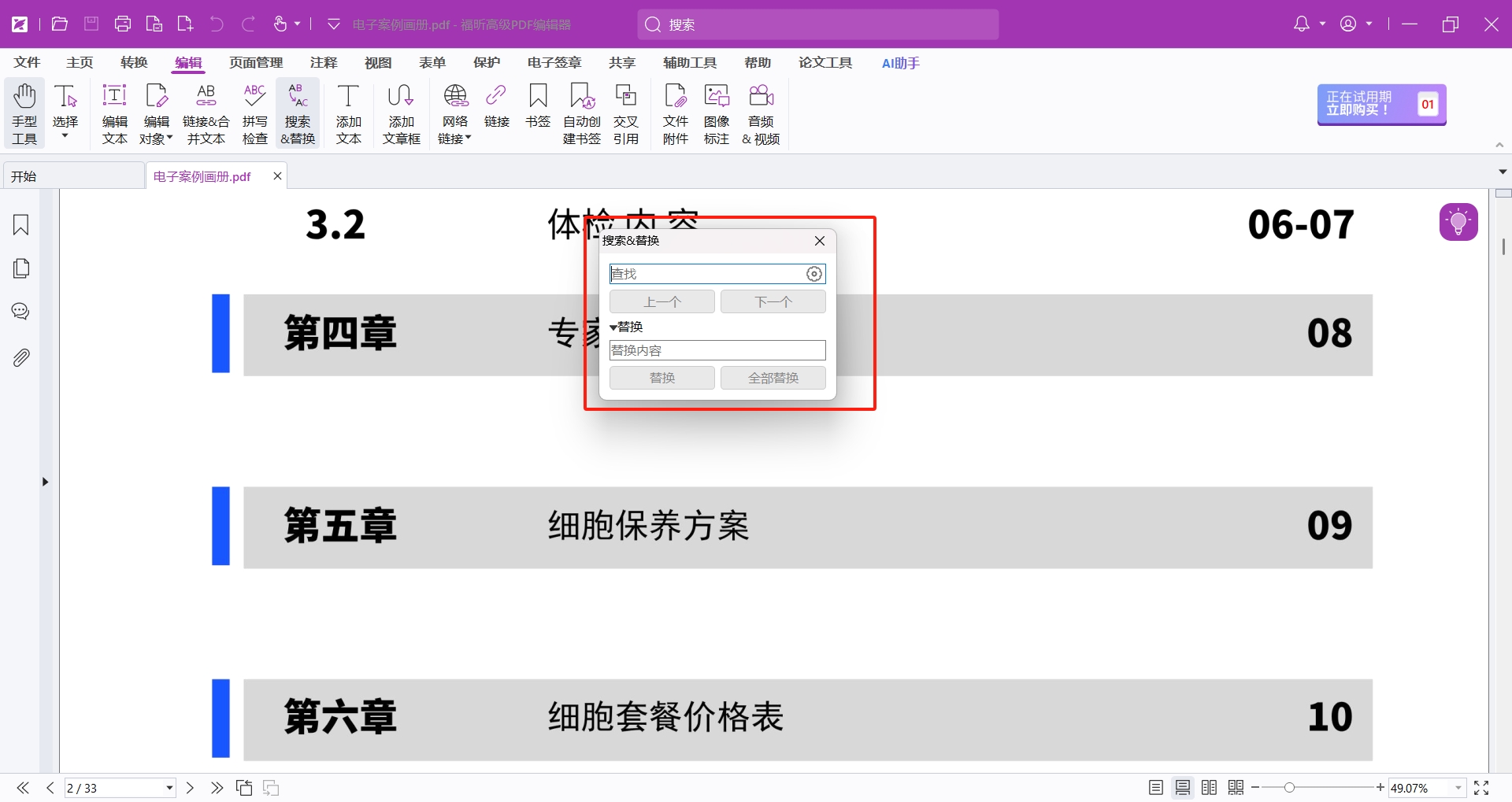 在打开PDF文档之后,选择【编辑】中的【搜索并替换】。