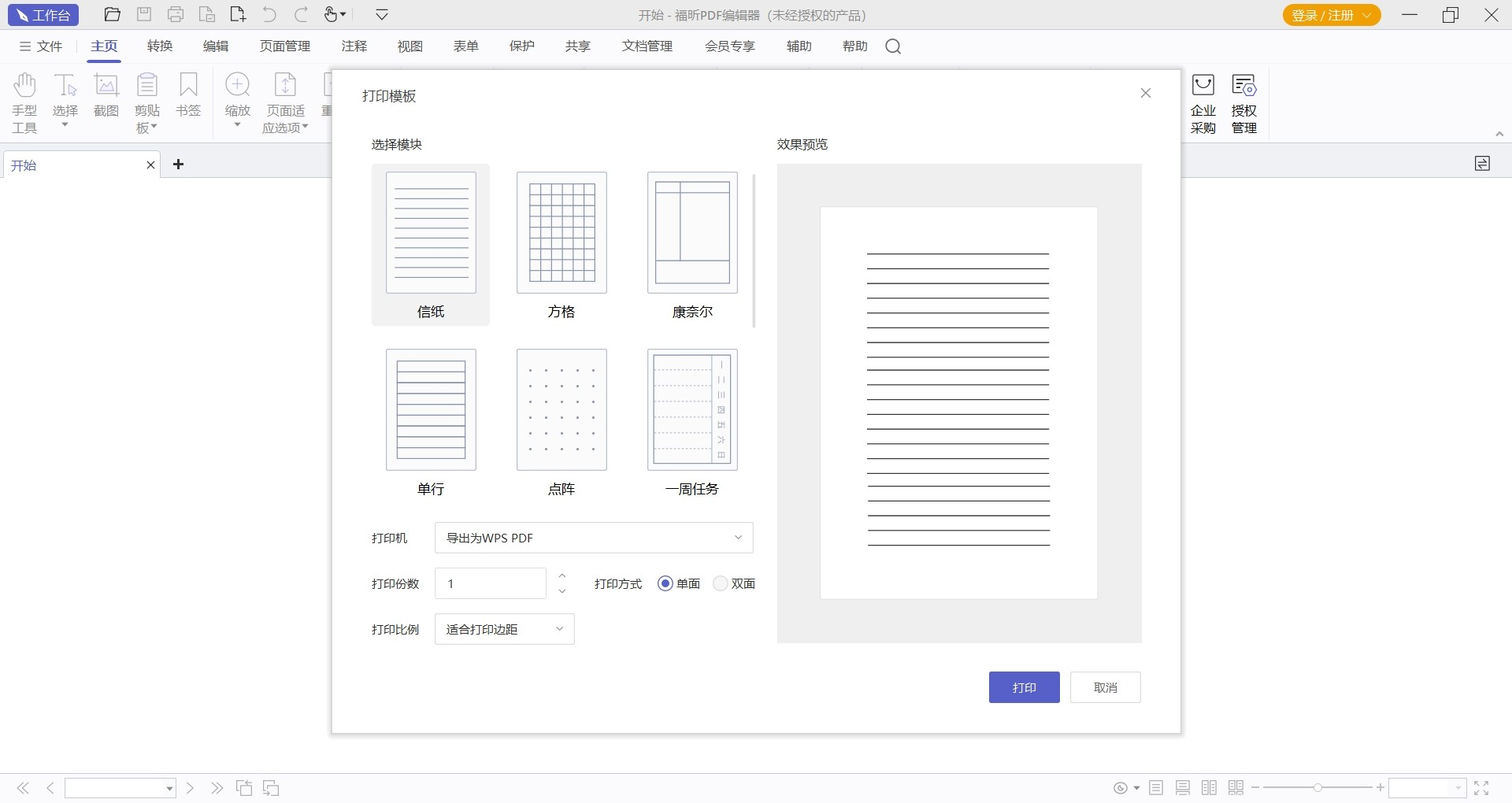 点击【文件】菜单中的【打印模板】选项,根据您的需求选择合适的模板,如信纸、方格、单行、点阵等,无需复杂设置即可直接应用。如果列表中没有您所需的模板,您还可以访问【更多模板】来寻找。