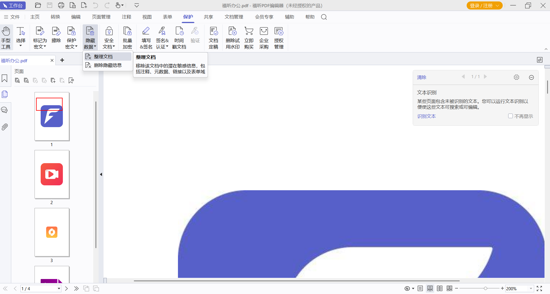 打开PDF文档之后,点击【保护】-【隐藏数据】-【整理文档】,即可一次性删除PDF文件中的所有隐藏信息。
