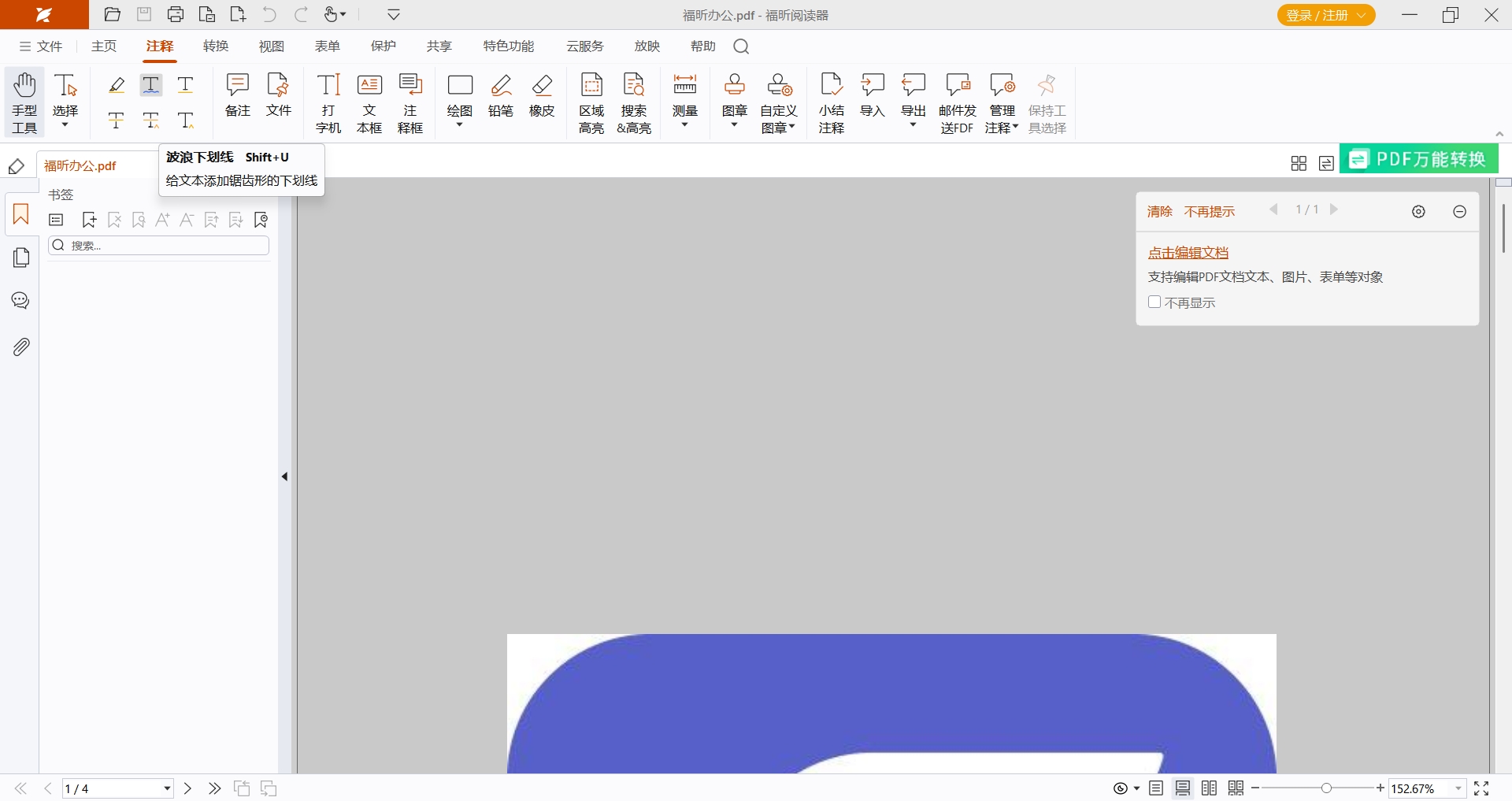 想要给PDF文档添加波浪线,我们可以用专业的工具来处理,今天要和大家推荐的是福昕高级PDF编辑器,这是一款针对PDF文档的编辑器,不仅可以阅读PDF文档,还可以编辑PDF文档内容,另外就是今天要和大家分享的注释功能——给PDF文档添加波浪线,下面来看看具体要怎么操作吧。