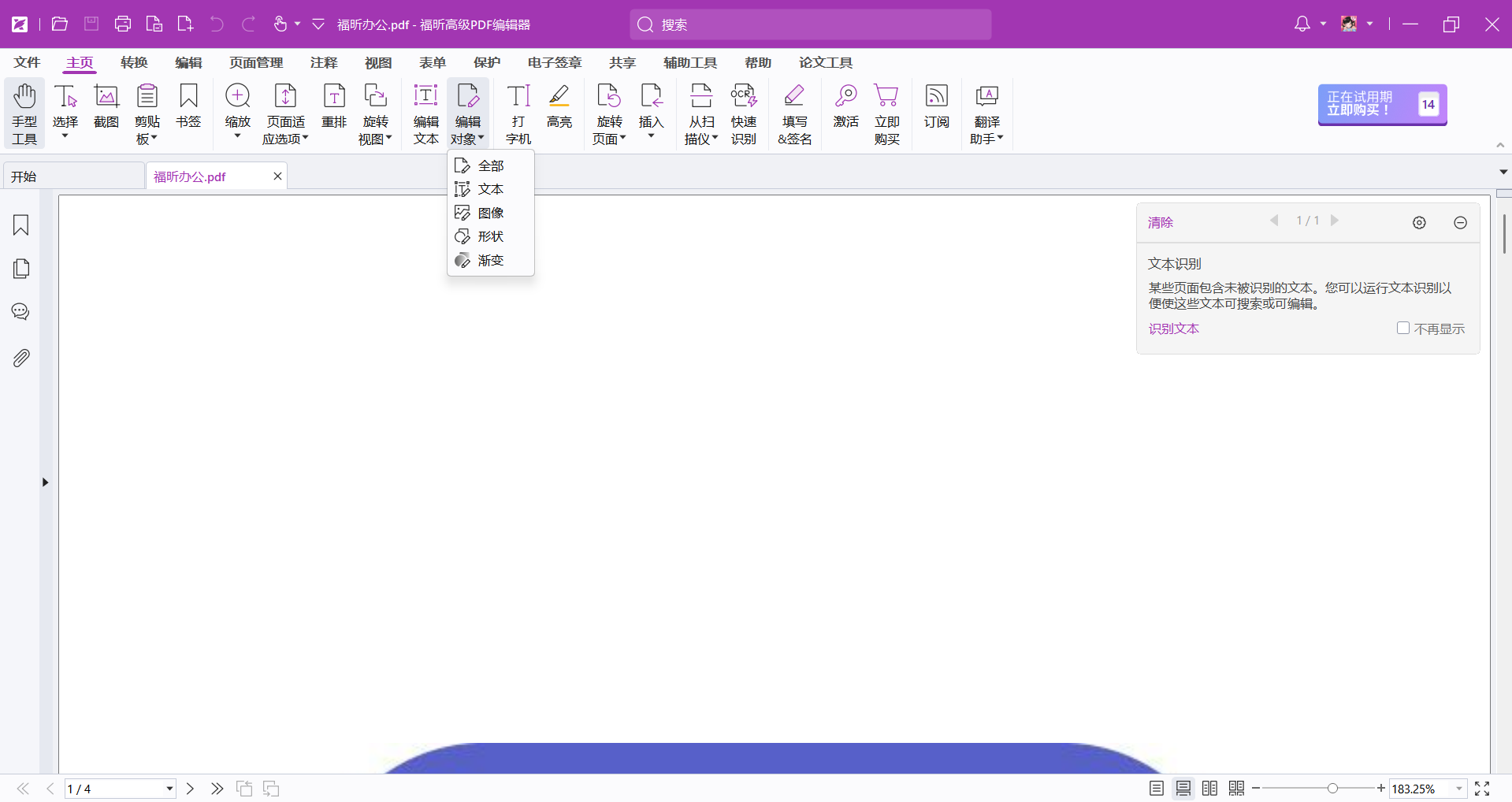 除了编辑PDF文档之外,福昕PDF编辑器还有个很厉害的功能,就是OCR(光学字符识别)。这个功能能把你扫描的PDF文件里的图片文字变成可以编辑的文本。这样一来,编辑器的用途就更广了,用起来也更顺手,特别是处理和编辑扫描的PDF文件的时候。那么下面先来看看这款工具怎么加粗文本吧。