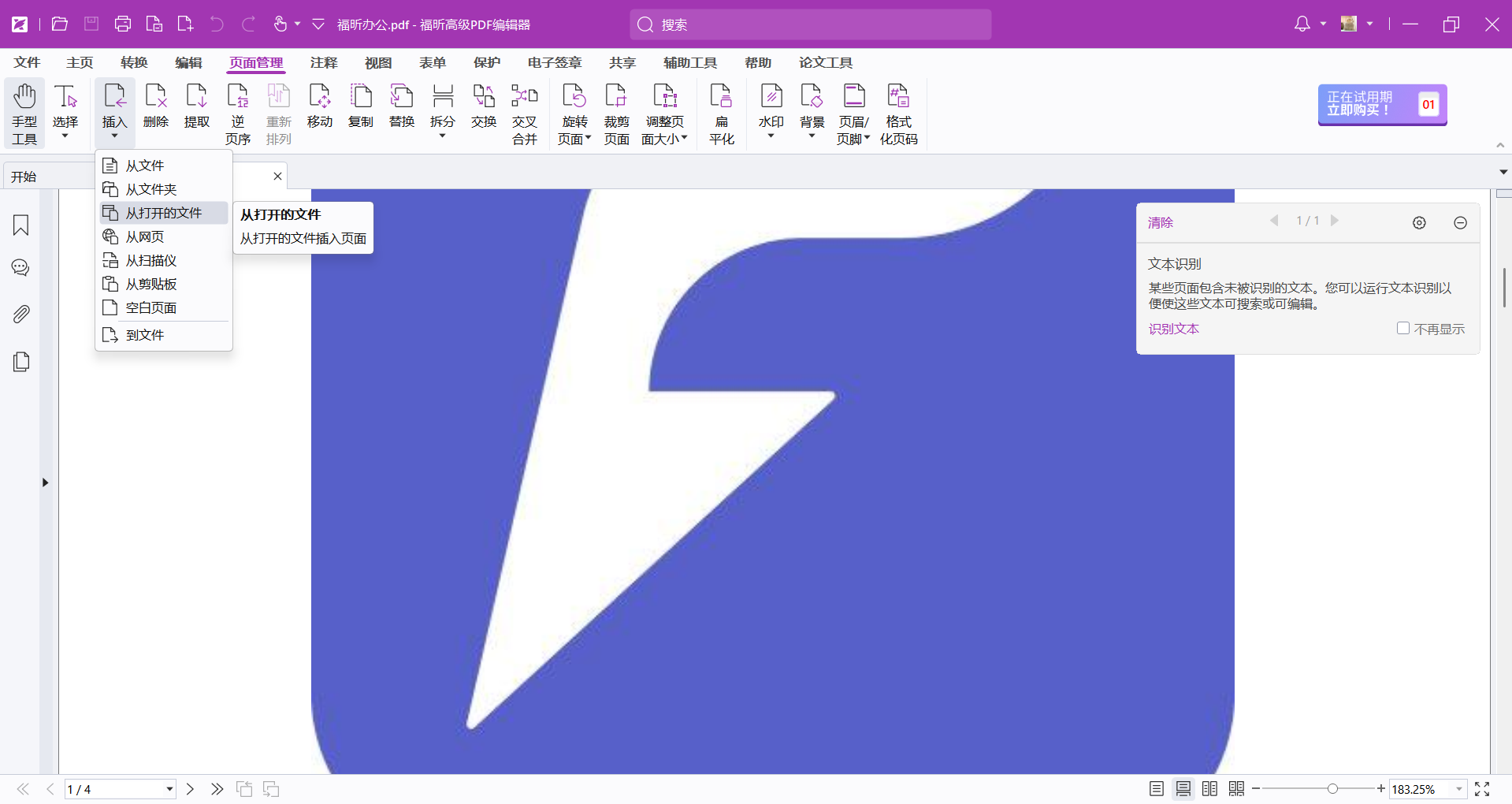 福昕PDF编辑器个人版具有便捷的PDF文件编辑功能,其中包括了PDF后插入页面的特性。用户可以轻松地在已有的PDF文档中插入新页面,实现对文档内容的自由调整和编辑。通过简单的操作,用户可以快速实现页面插入,提高工作效率。这一功能使得此工具成为处理PDF文件的理想选择,无论是在个人办公还是学习中都能发挥重要作用。