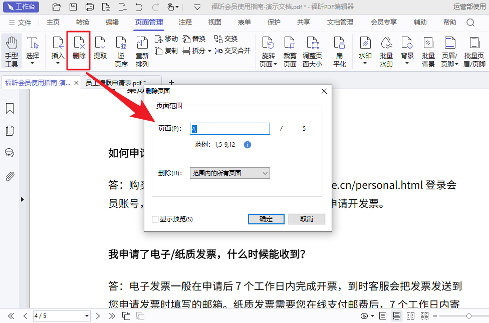 打开PDF文档之后,点击【页面管理】中的【删除】,然后在弹窗中选择好需要删除的PDF页面范围以及删除的参数,最后记得保存文档就可以了。