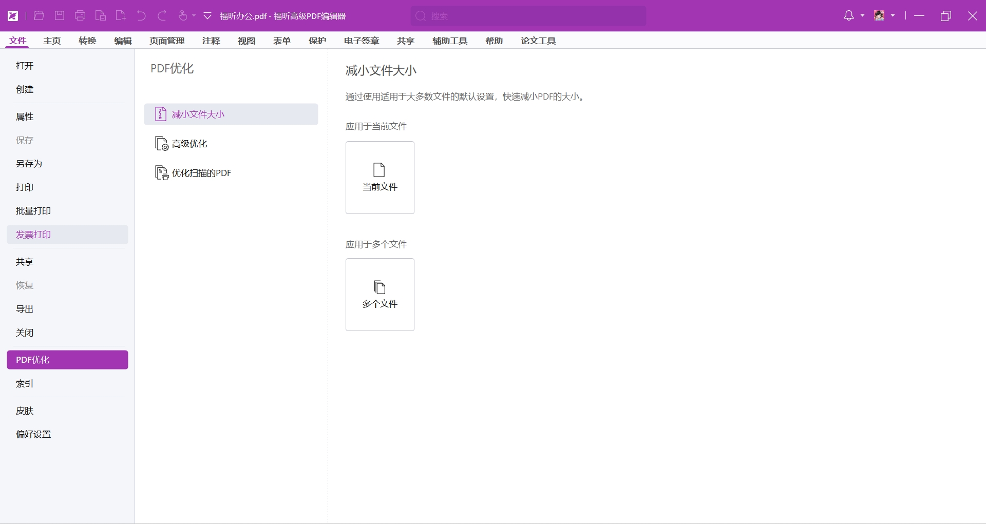 在福昕官网中下载正版福昕高级PDF编辑器,下载完成后点击安装到电脑中。安装成功后就可以双击软件开始使用了。之后打开软后,点击【文件】-【PDF优化】,进入相对应页面。