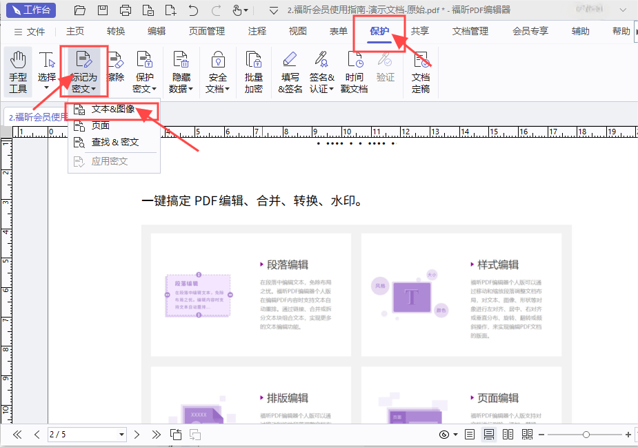 在选择好功能之后,我们就可以利用保护功能中的【标记为密文】,将PDF文档中的部分内容,不管是文字还是图片标记为密文,让别人无法查看,从而起到保护PDF文档的作用。最后别忘记点击保存。