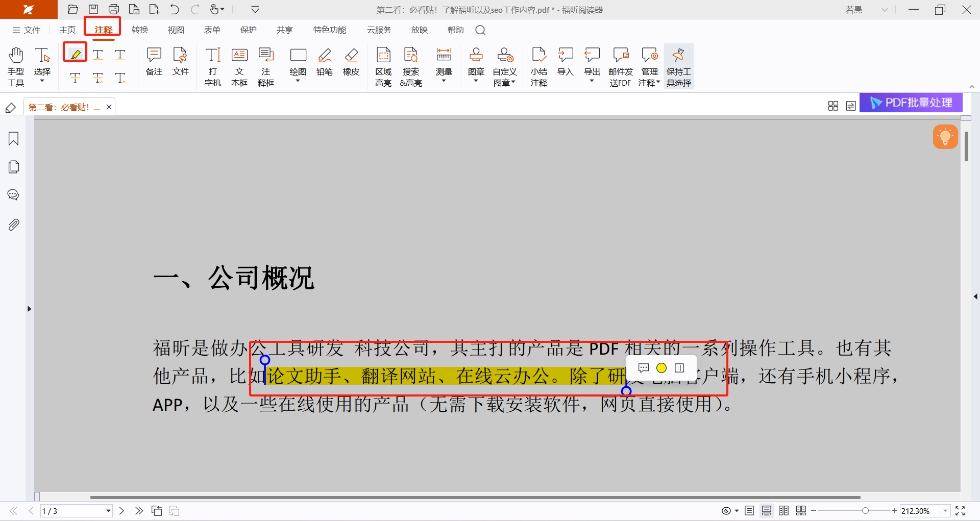 福昕PDF编辑器作为一款PDF工具,不仅支持PDF文档的修改,同时还具备PDF阅读和注释的功能,能够帮助我们快速完成PDF文档的注释。如果你需要在PDF中标记出重要的内容,可以使用PDF编辑器的高亮注释功能以及文本注释等功能,下面一起来看看福昕PDF编辑器要如何在PDF文档中添加高亮标记吧。