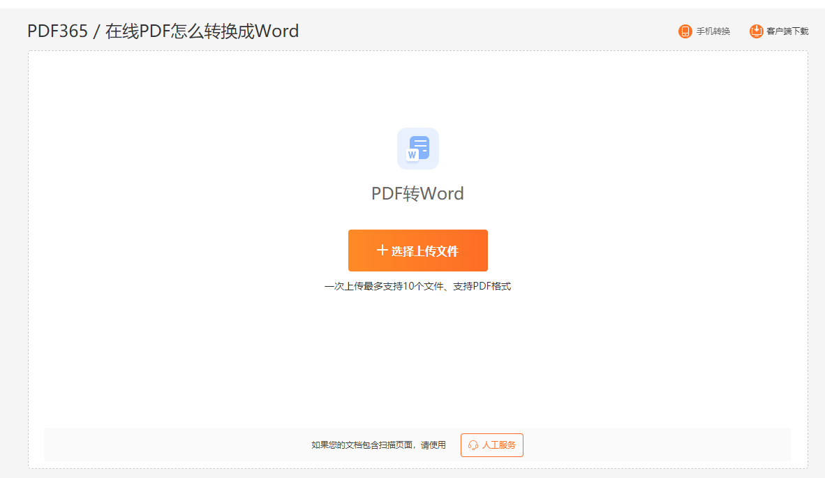进入功能页面,上传要转换的PDF文档,一次最多可以处理10个PDF文档转换。