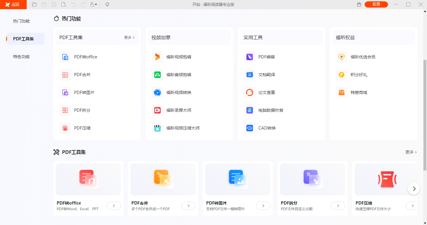 一样的,需要先下载安装软件,进福昕官网找到软件下载即可。下载安装完毕,打开软件,在左侧的热门功能PDF工具集中找到【PDF转office】并点击。