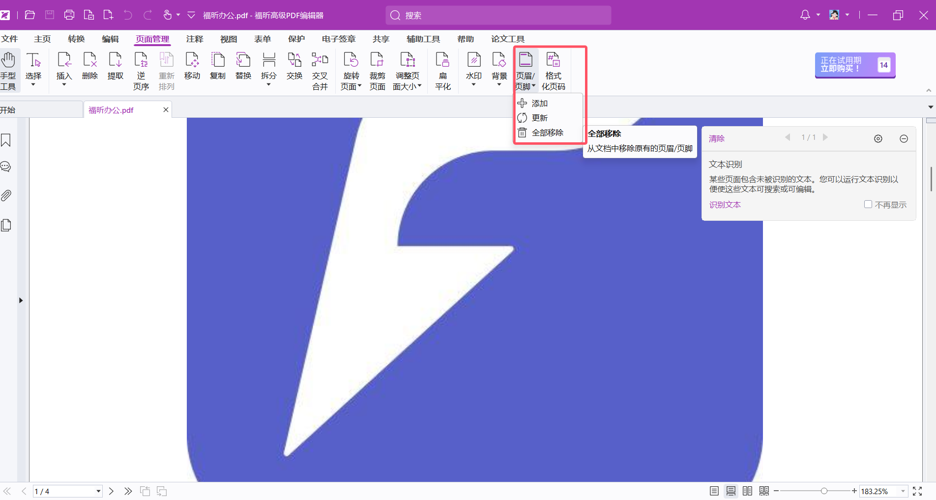 打开PDF文档之后,然后点击【页面管理】中的【页眉/页脚】