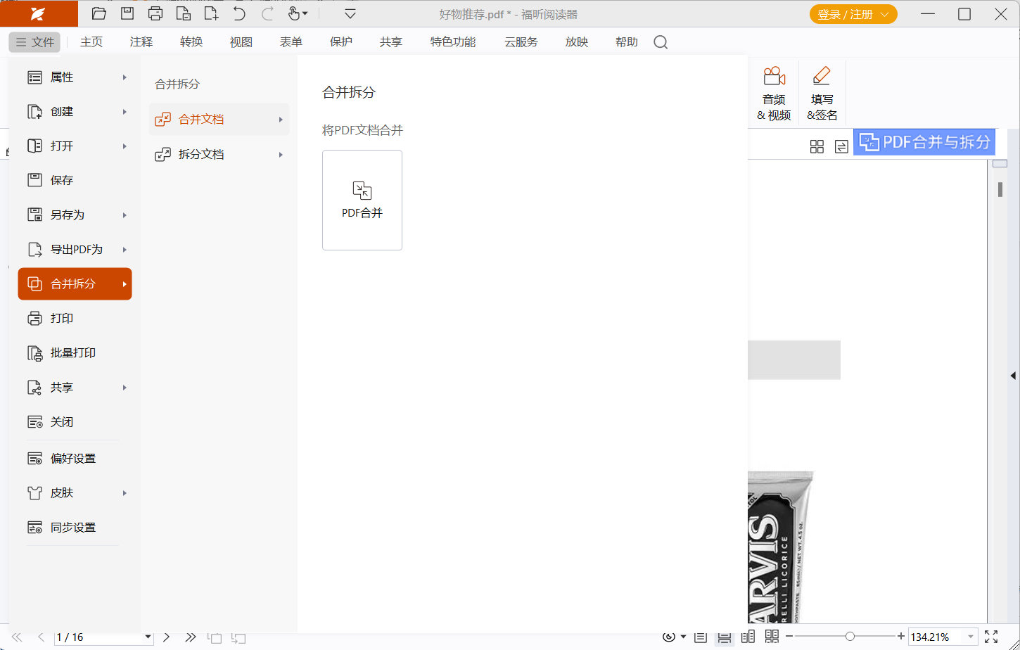 在打开的PDF文件中,点击【文件】-【合并拆分】,然后选择【合并文档】,点击【PDF合并】然后在弹窗中选择合并的文档就可以了。