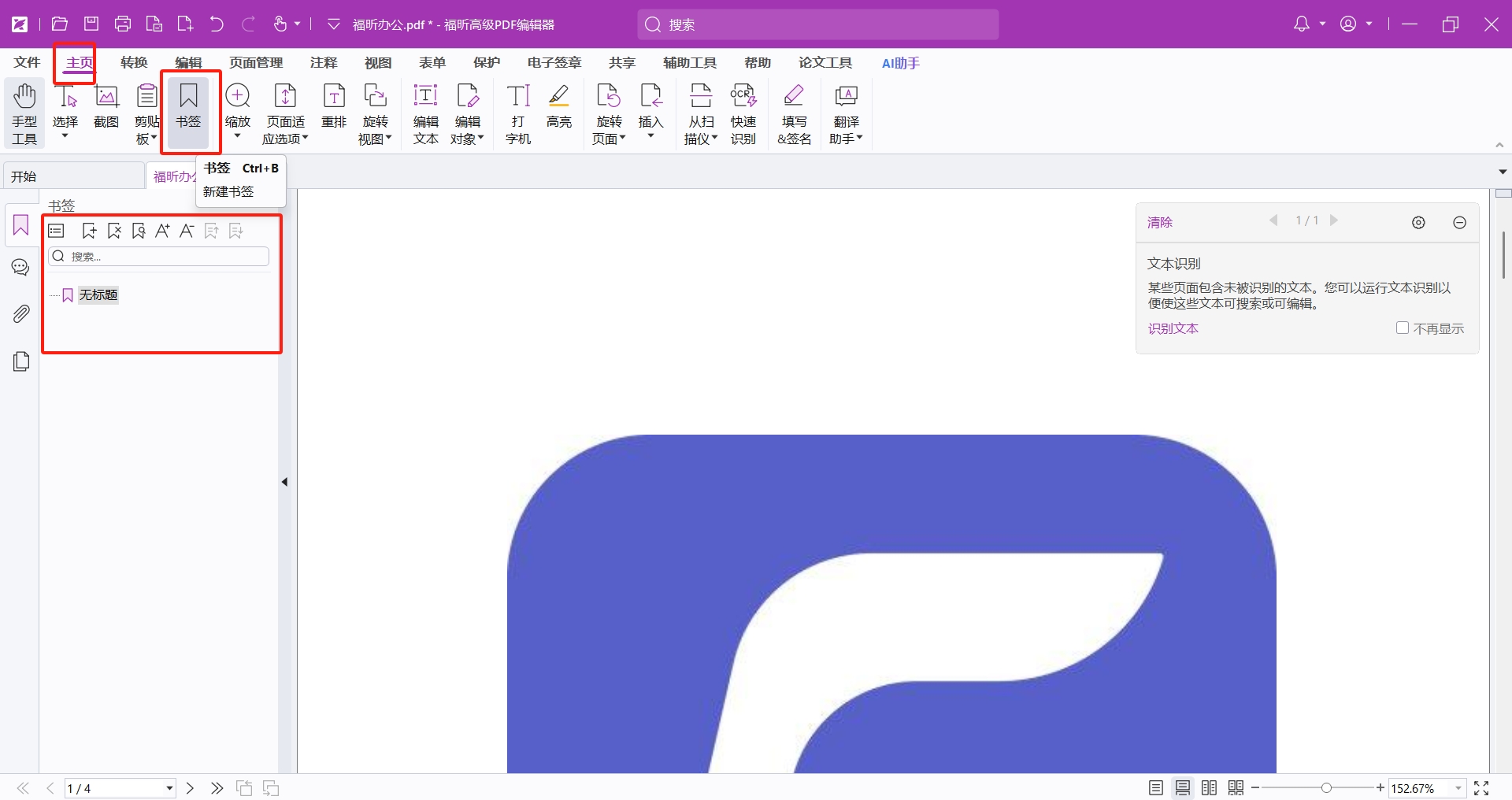 第二步:在打开文件后,可以通过点击功能栏中的【主页】-【书签】来添加目录内容。