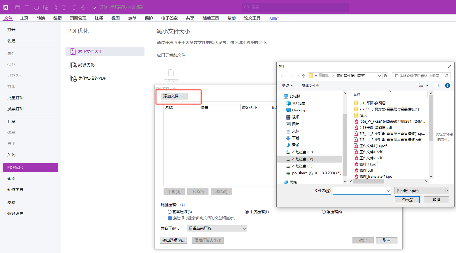 打开软件界面后,找到左上角的文件,在下拉选项里选【PDF优化】然后上传文件,这里可以批量上传,然后进行压缩。
