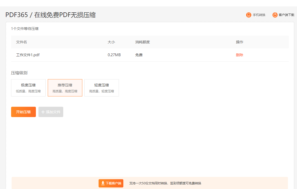 文件上传成功后,可以选择【极度压缩】【推荐压缩】【轻度压缩】选择完成后,点击【开始压缩】等待压缩成功,下载文件即可。