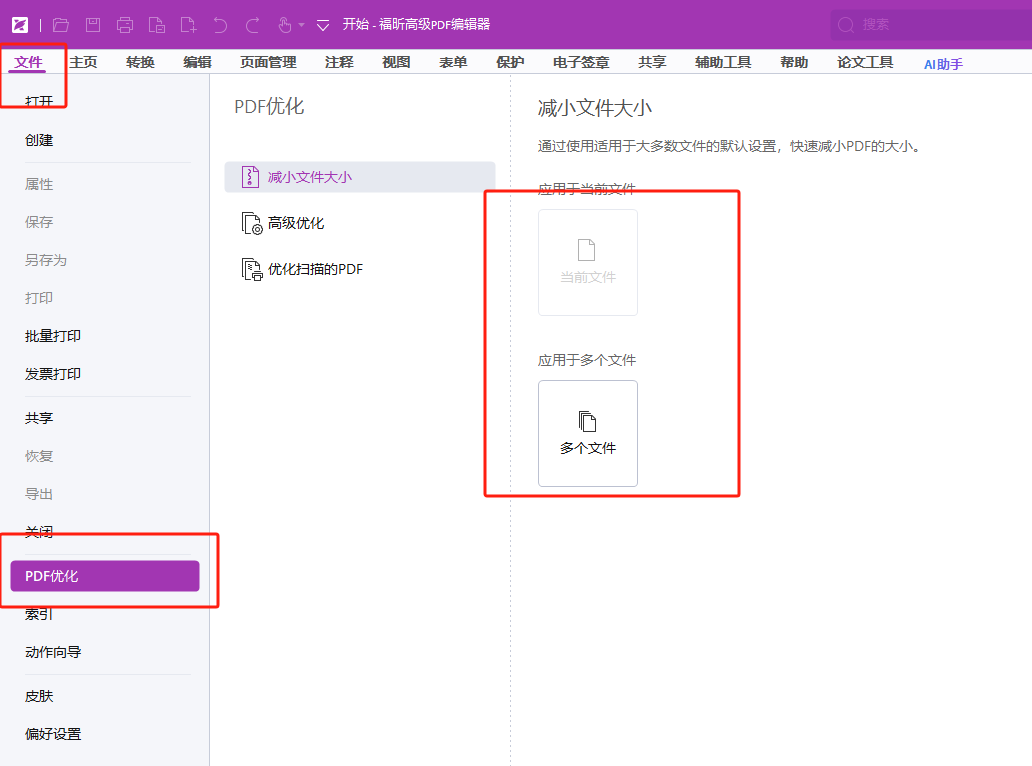 下载安装好高级PDF编辑器后,打开软件,点击文件,选择【PDF优化】后,1.选择减小文件大小、通过使用适用于大多数文件的默认设置,快速减小PDF的大小。2.选择高级优化,通过分析文件大小并根据文件类型选择专业设置来实现最佳优化。3.选择优化扫描的PDF,以减小尺寸并获得更好的显示效果。按照自己需求选择,一般情况选择第一个居多。