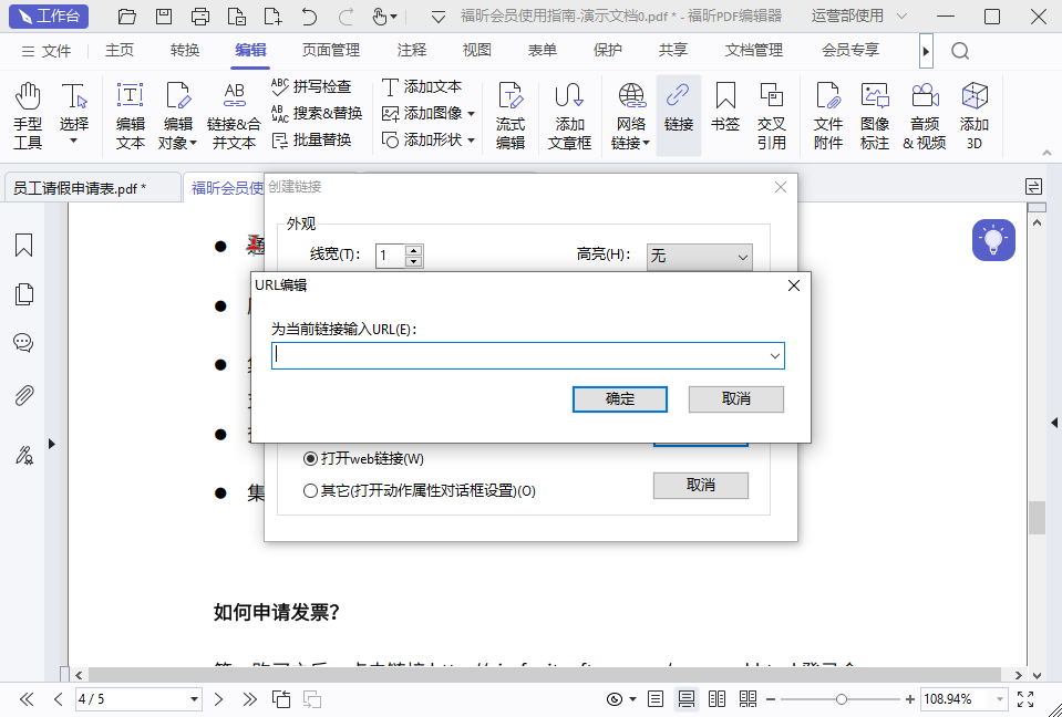 打开PDF文件后,点击顶部导航栏的“编辑”选项,然后选择“网络链接”功能,用鼠标选中需要添加链接的文字或区域。在弹出的创建链接弹窗中,选择“打开web链接”,输入目标网址,然后点击确定。