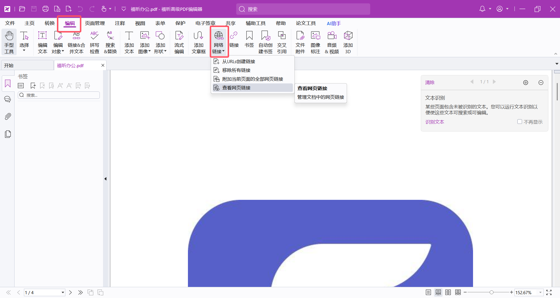2-选择功能 打开PDF文件,点击顶部导航栏的“编辑”选项,选择“网络链接”。