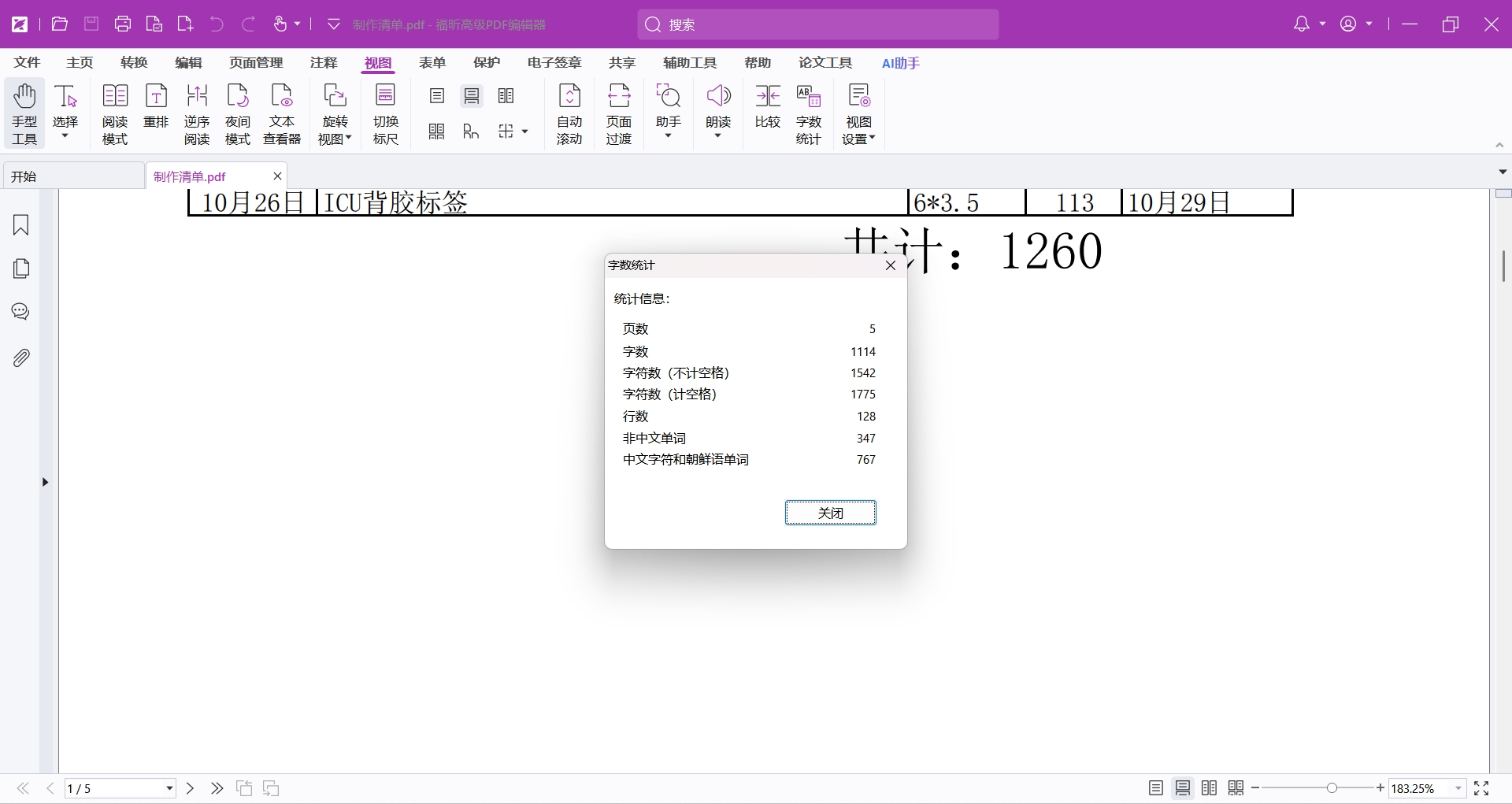 第二步,在打开的PDF文件中,点击【视图】-【字数统计】,点击后,会出现一个弹窗,弹窗中会显示PDF文件中一共有多少个文字,如果你是扫描件的话,则会显示为0,需要先识别后再进行查看。